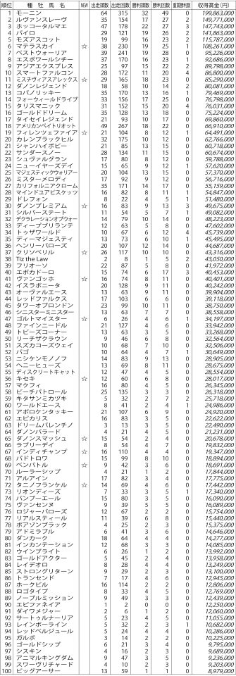 【2025年度 地方競馬2歳サイアーランキング】 2026.02.06 #地方競馬2歳サイアーランキング 順位 種 牡 馬 名 NEW 出走頭数 出走回数 勝利頭数 勝利回数 重賞勝利数 収得賞金(円) 1 モーニン 64 315 32 49 0 199,863,000 2 ルヴァンスレーヴ 35 154 17 27 2 1...