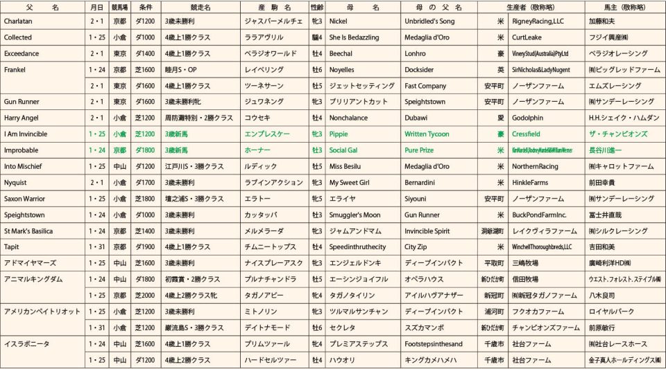 中央競馬 種牡馬別勝ち馬一覧(1回中山、1回京都、1回小倉、1回東京、2回京都)1月24日~2月1日 2026.03.01 #中央競馬 #種牡馬別勝ち馬一覧 表を全体表示 × 父 名 月日 競馬場 条件 競走名 産 駒 名 性齢 母 名 母 の 父 名 生産者 (敬称略) 馬主 (敬称略) Charlatan 2・1 京都 ダ1200 3歳未勝利 ジャスパ...