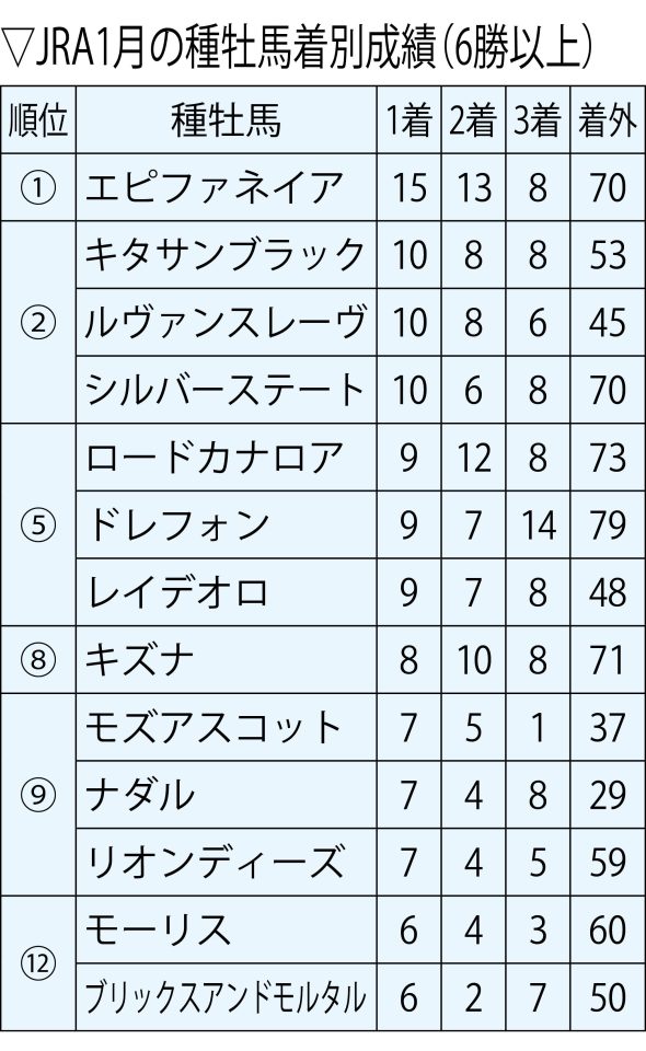 【JRA種牡馬別1月勝利数】エピファネイアが2026年首位発進!ルヴァンスレーヴとシルバーステートは初の月間2桁勝利 2026.03.02 #JRA種牡馬別1月勝利数 1月のJRA種牡馬別月間勝利数は、15勝を挙げたエピファネイアが首位だった。連対率は26.4%。小倉牝馬Sをジョスラン(牝4、母ケイティーズハート=ハーツクライ、安平・ノーザンファーム生産、馬主・吉田和美氏、美浦・鹿戸...