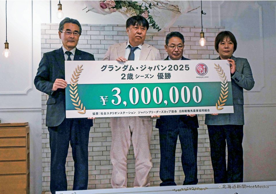 2025グランダム・ジャパン2歳シーズン表彰式 上山牧場生産リュウノフライトの関係者にボーナス300万円 2026.03.04 #2025 #2歳シーズン #グランダム・ジャパン #表彰式 GDJ2025の2歳シーズン表彰式が2月19日に札幌市内で行われた。地方競馬全国協会の相川貴志理事から、優勝したリュウノフライト(父ホッコータルマエ、母ピエールナオチャン=ケイムホーム、浦河・上山牧場生産、馬主・蓑島竜...
