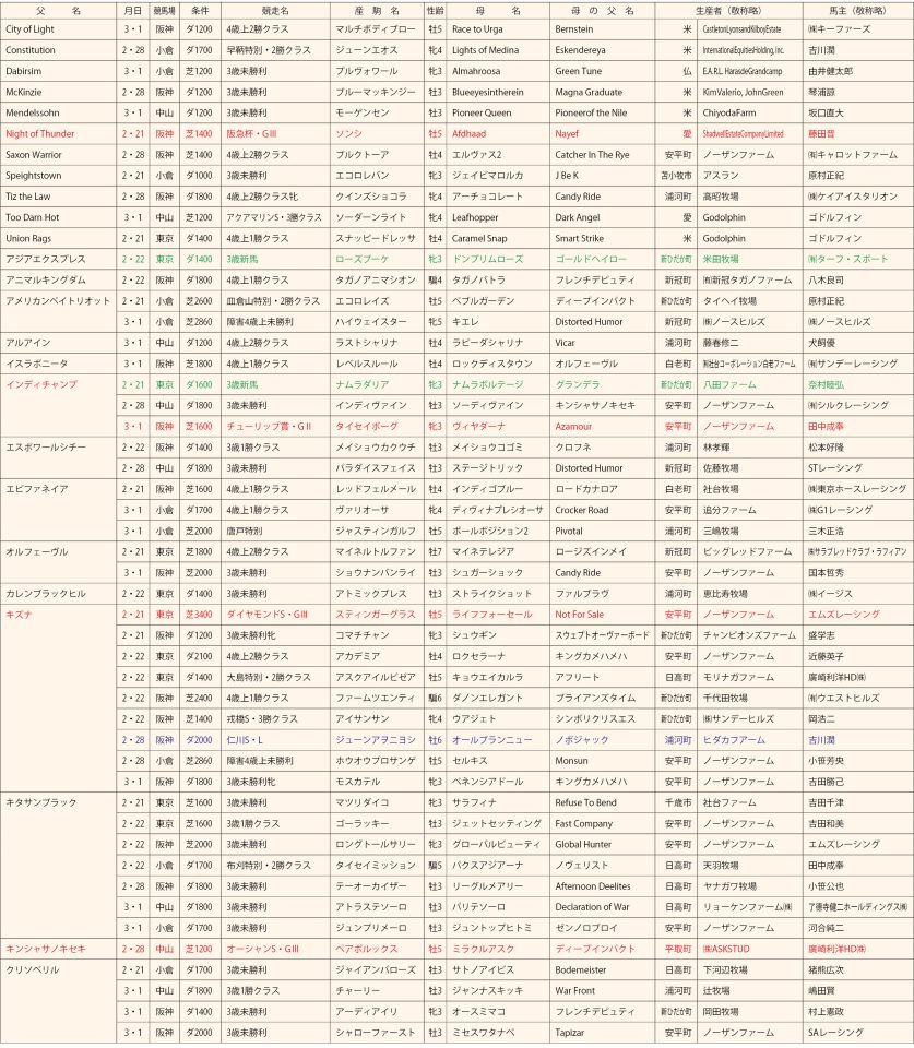 中央競馬 種牡馬別勝ち馬一覧(1回東京、2回中山、1回阪神、1回小倉)2月21日~3月1日 2026.03.24 #中央競馬 #種牡馬別勝ち馬一覧 表を全体表示 × 父 名 月日 競馬場 条件 競走名 産 駒 名 性齢 母 名 母 の 父 名 生産者 (敬称略) 馬主 (敬称略) City of Light 3・1 阪神 ダ1200 4歳上2勝ク...