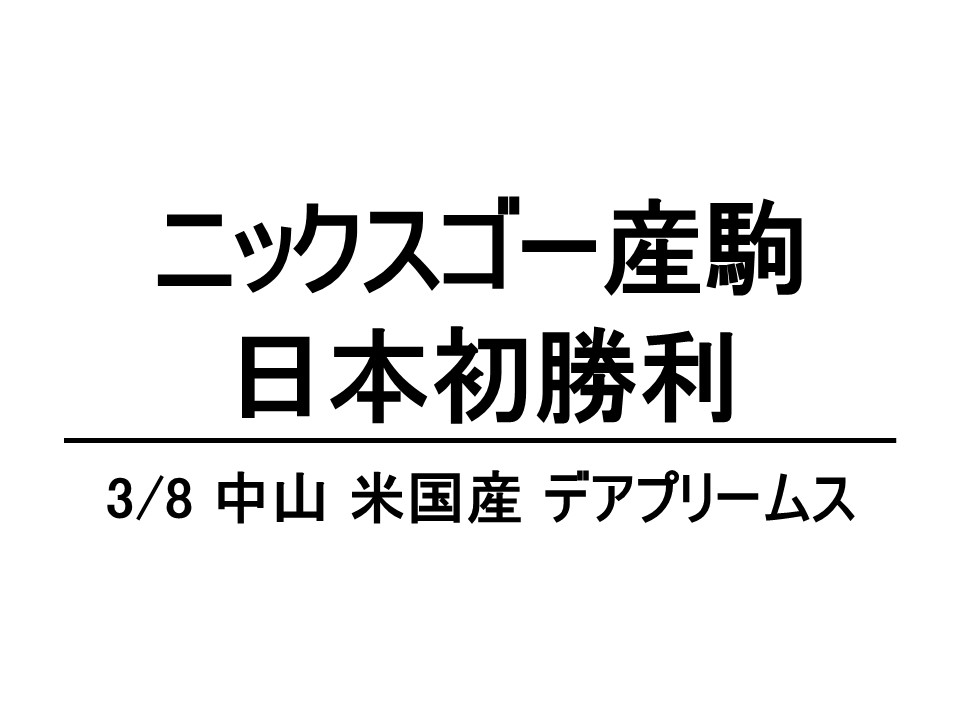 韓国で供用中の種牡馬ニックスゴー産駒が日本初勝利をマーク 3月8日中山で米国産デアプリームス 2026.04.09 #ニックスゴー産駒 3月8日中山2R3歳未勝利(ダ1200m)で、米国産馬デアプリームス(牝、母アズアイプリーズ=マジェスティックウォリアー、馬主・㈱ノルマンディーサラブレッドレーシング、美浦・田島俊明厩舎)が1着となり、ニックスゴー産駒...