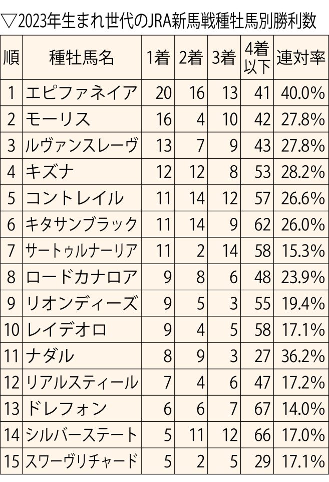2023年生まれJRA新馬戦が終了 種牡馬別最多はエピファネイアが20勝 新種牡馬1位はコントレイル 2026.04.04 #JRA新馬戦 25年6月7日阪神5Rから始まった23年生まれのJRA新馬戦が、2月22日阪神4Rで終了した。304競走(芝203レース、ダート101レース)行われた。種牡馬別勝利数ではエピファネイアの20勝が最多だった。 世代最初...