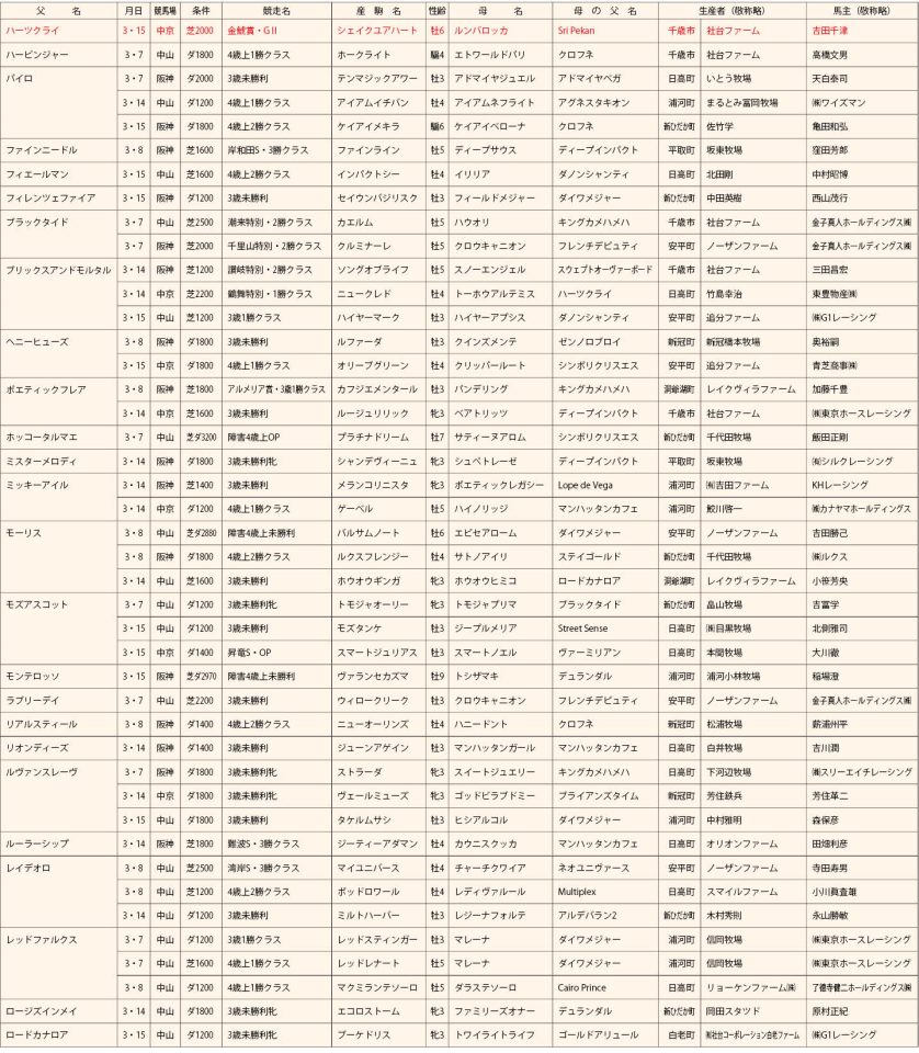 中央競馬 種牡馬別勝ち馬一覧(2回中山、1回阪神、1回中京)3月7日~15日 2026.04.05 #中央競馬 #種牡馬別勝ち馬一覧 表を全体表示 × 父 名 月日 競馬場 条件 競走名 産 駒 名 性齢 母 名 母 の 父 名 生産者 (敬称略) 馬主 (敬称略) Global Campaign 3・7 阪神 ダ1800 4歳上1...