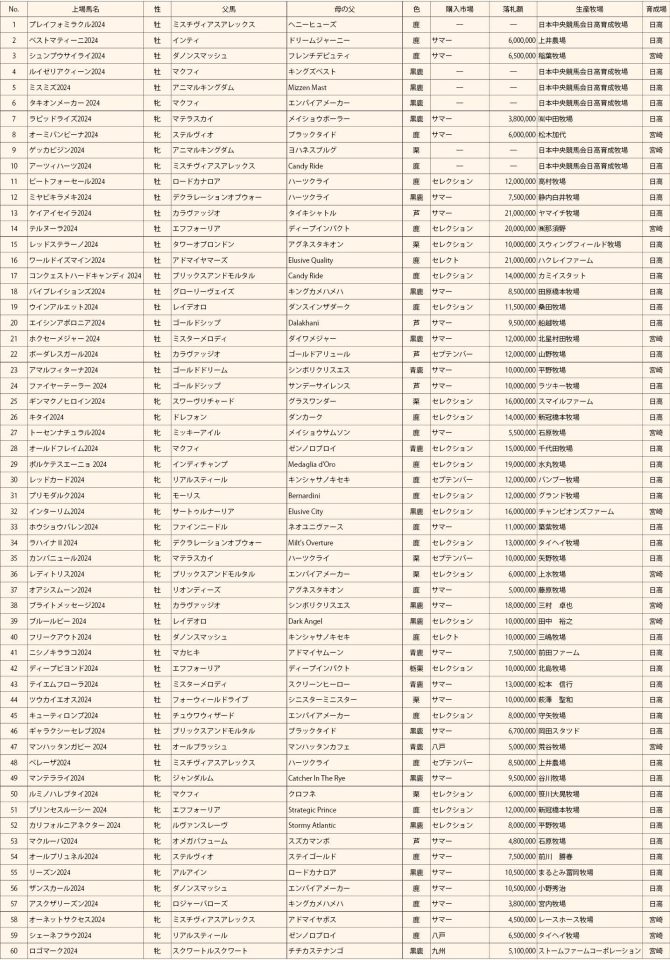 2026JRAブリーズアップセール上場予定馬 2026.04.07 #2026JRAブリーズアップセール 表を全体表示 × No. 上場馬名 性 父馬 母の父 色 購入市場 落札額 生産牧場 育成場 1 プレイフォミラクル2024 牡 ミスチヴィアスアレックス ヘニーヒューズ 鹿 ─ ─ 日本中央競馬会日高育成牧...