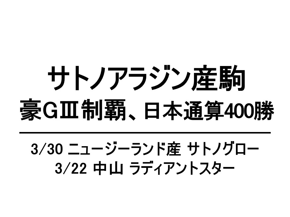 サトノアラジン産駒でNZ産サトノグローが豪GⅢ制覇 サトノアラジンは日本で通算400勝も達成 2026.04.18 #サトノアラジン産駒 昨夏からニュージーランドに拠点を移したサトノアラジンの新国産の産駒サトノグロー(牝2、母エレクトロード=ピンズ)が3月30日、3馬身差の快勝で豪のサラブレッドブリーダーズS(GⅢ、1着賞金約2200万円、芝1200m)...