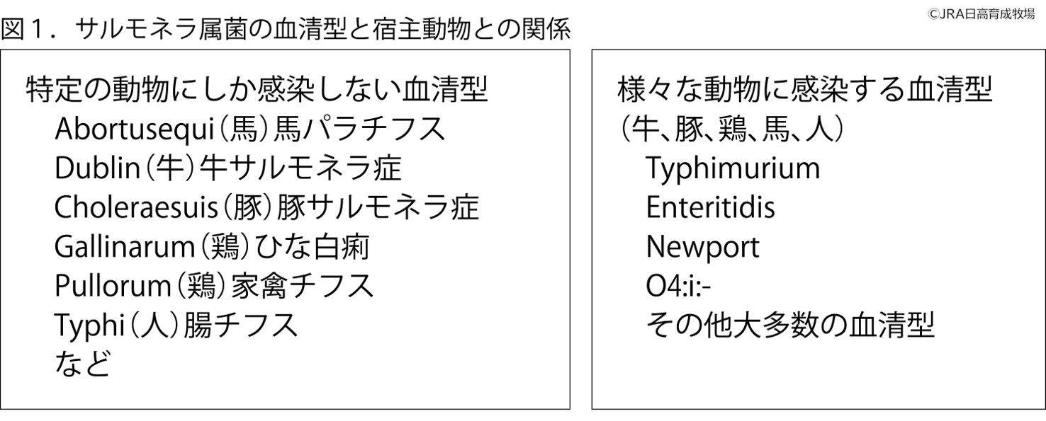 サルモネラ感染症は、サルモネラ属菌によって起こる病気です。人や動物に病気を起こすサルモネラ属菌は、菌種としては1種類ですが、亜種としては6種類、さらに細かな分類である血清型では2500種類以上に分けられています。このように多様なサルモネラ属菌には、特定の動物のみに病気を起こす血清型と様々な動物に病気を起こす血清型が存在します(図1)。前者には、Abortusequi(馬パラチフス菌)やTyphi(チフス菌)などが含まれており、後者にはTyphimurium(ネズミチフス菌)やEnteritidis(腸炎菌)を始めとした大多数の血清型が含まれています。後者の血清型によって起こる病気を、総称してサルモネラ症と呼んでいます。馬のサルモネラ感染症といえば国内では馬パラチフスがよく知られていますが、海外ではネズミチフス菌を中心としたサルモネラ症の発生が多く確認されています。