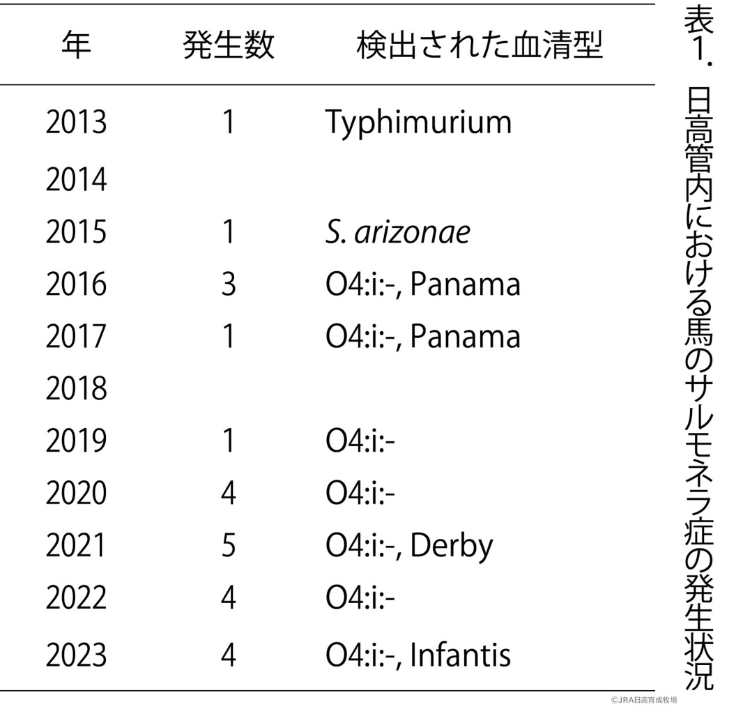馬のサルモネラ症は、他の家畜と比較しても少なく、ときおり牧場内の集団発生が認められる程度です。日高管内では1981~2年にかけて述べ20戸52頭が感染し、9頭が死亡するというサルモネラ症の大きな流行がありました。しかし、それ以降は日高管内や胆振管内の軽種馬生産牧場や十勝の重種馬生産牧場において散発的な発生が確認されるのみで、発生の少ない時期が続いていました。しかし、近年、日高管内において毎年のように馬のサルモネラ症が発生しています(表1)。これらの事例から検出される血清型の多くは、O4:i:-という血清型で、鞭毛の一部を失ったネズミチフス菌の変異株と考えられています。O4:i:-は、1997年にスペインで確認されて以降、世界中に広がり、日本においても2000年代ごろから検出されはじめ、現在では牛や豚で最も多く検出されている血清型となりました。2016年以降に日高管内で発生したO4:i:-による集団感染事例の中には同じ遺伝的特徴を持つ株によって馬と牛が感染している事例あることがわかり、日高管内では動物種を超えてサルモネラが伝播したことが明らかとなっています。