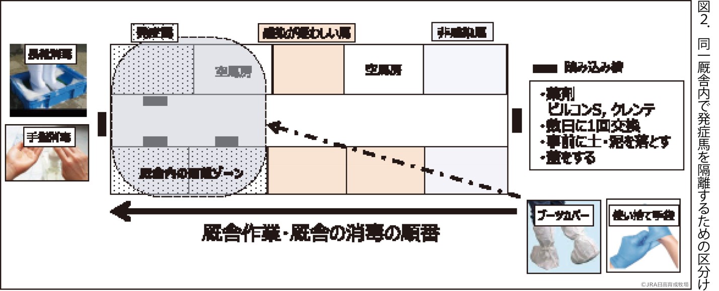 ④馬の管理:感染していない馬の手入れを最初に行うなど牧場内での作業の流れ(動線)や厩舎内で感染区域の区分け(図2)を意識することが必要です。