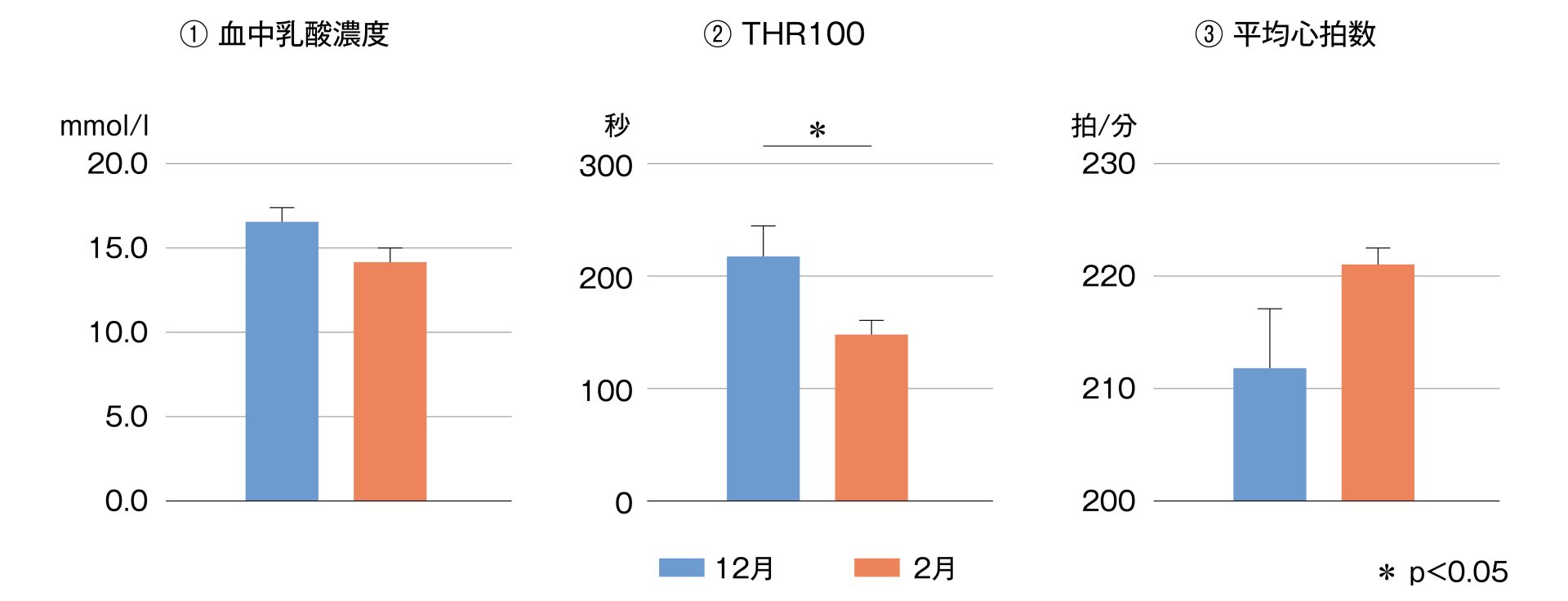 25年の試験では、1時間のウォーキングマシンでの準備運動後、傾斜6%で常歩、速歩に続き、秒速8mで60秒、秒速12mで120秒の駈歩を行うメニューを実施しました。12月と2月のデータを比較した結果、2月では①血中乳酸濃度が低下し、有酸素運動能力の向上が確認できました。また、②THR100も有意に短縮し、心肺機能の向上も認められました。③平均心拍数は若干上昇しましたが有意な差は認められませんでした。さらに、12月には試験を実施した53頭のうち6頭がオールアウト(疲労困憊で走れなくなる状態になる)しましたが、2月は45頭全頭が完走し、騎乗調教による能力向上も実感できました。